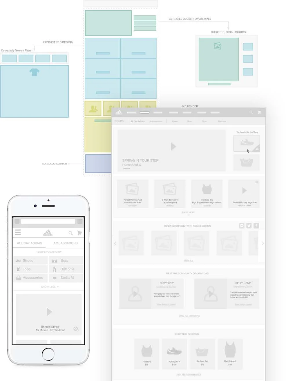 Taking mobile first approach, we created a series of wireframes for the experience and tested these with the demographic prior to the design phase. While staying consistent with the brand’s existing content, we were able to create a modern layout that made the women’s page feel like a unique shopping experience within the Adidas brand.