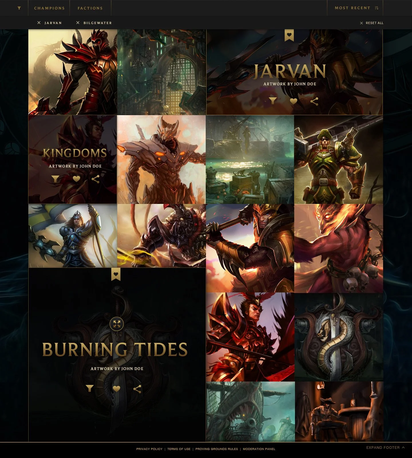 Active fans created large amounts of fan art, but there was no centralized place to be able to feature it on the LoL site. We were tasked to build a platform that showcased the community creations from around the world.
