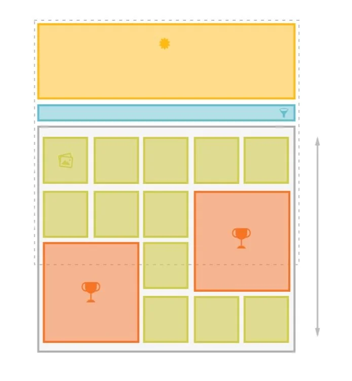 When working with the UX designer, we explored a few different options for how to organize the content, ultimately deciding on a content waterfall. Continuing to focus on the primary goal of highlighting fan art, we wanted to allow for as much to be surfaced right away, while still having designated space for other content.