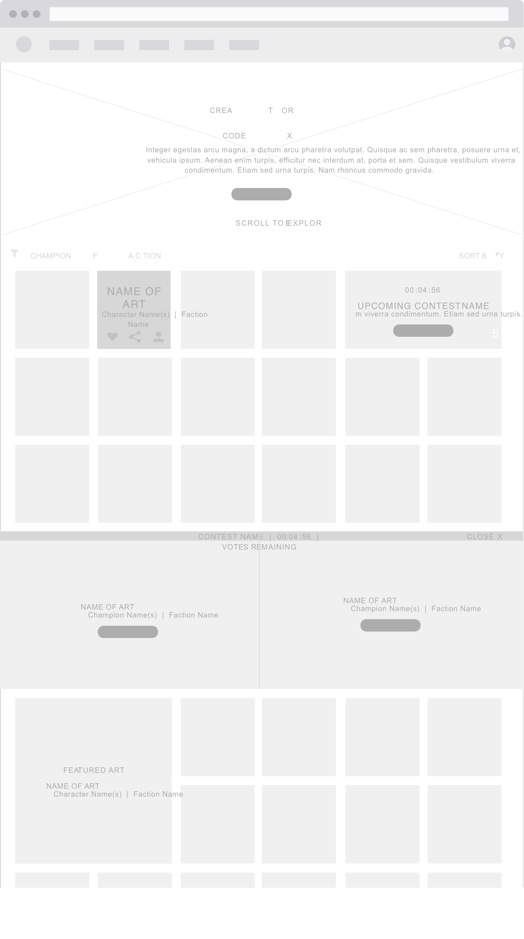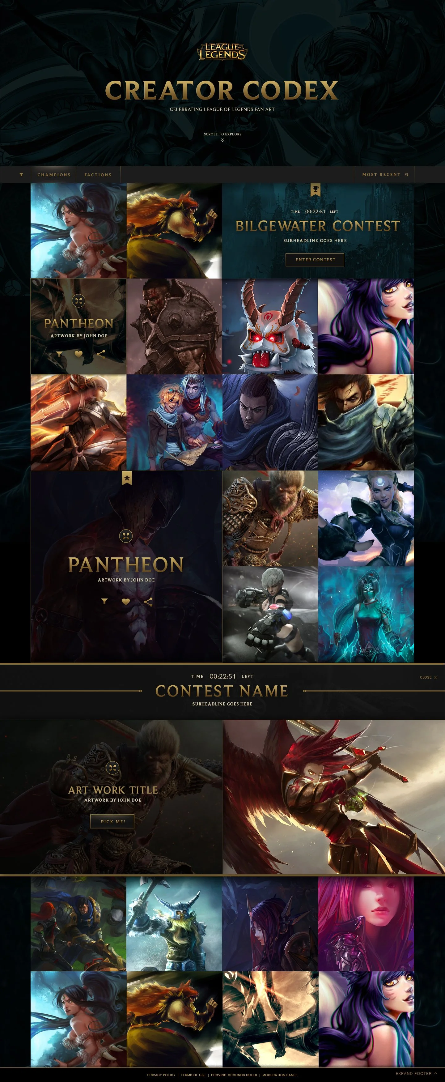 This styling was established by my Creative Director, and I helped assist him in building out the pages for desktop and mobile. When designing the pages, we wanted the styling to feel like you left your game, and were able to look at almost a trading card wall, highlighting all of your friends favorite heroes and villains. League of Legends has an already established look and feel on their site, and we wanted to make this site feel like it was designed by their own team, blending seamlessly. We wanted the style to be a perfect balance between jaw dropping imagery and clean typography, the design of the site allowed for users to view artwork from all over the world, submit their own, and vote in contests to promote the top artwork.