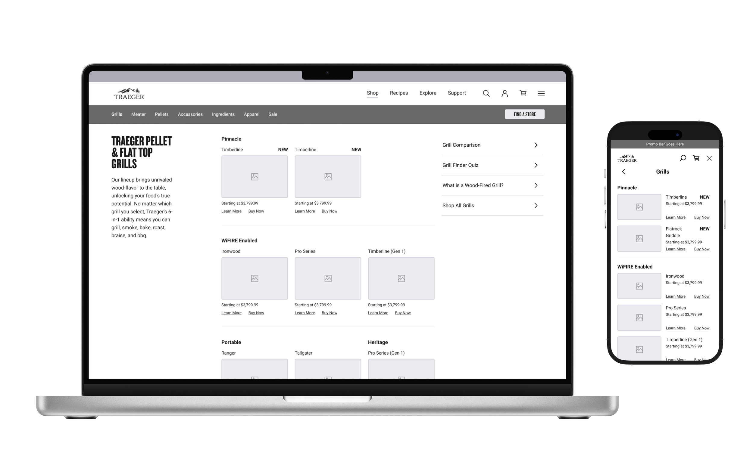 I have had the opportunity to restructure the site architecture for Traeger.com to ensure it met both business and customer needs. This led to a navigation redesign, making it easier for customers to shop, find recipes, explore the Traeger story, and access support.